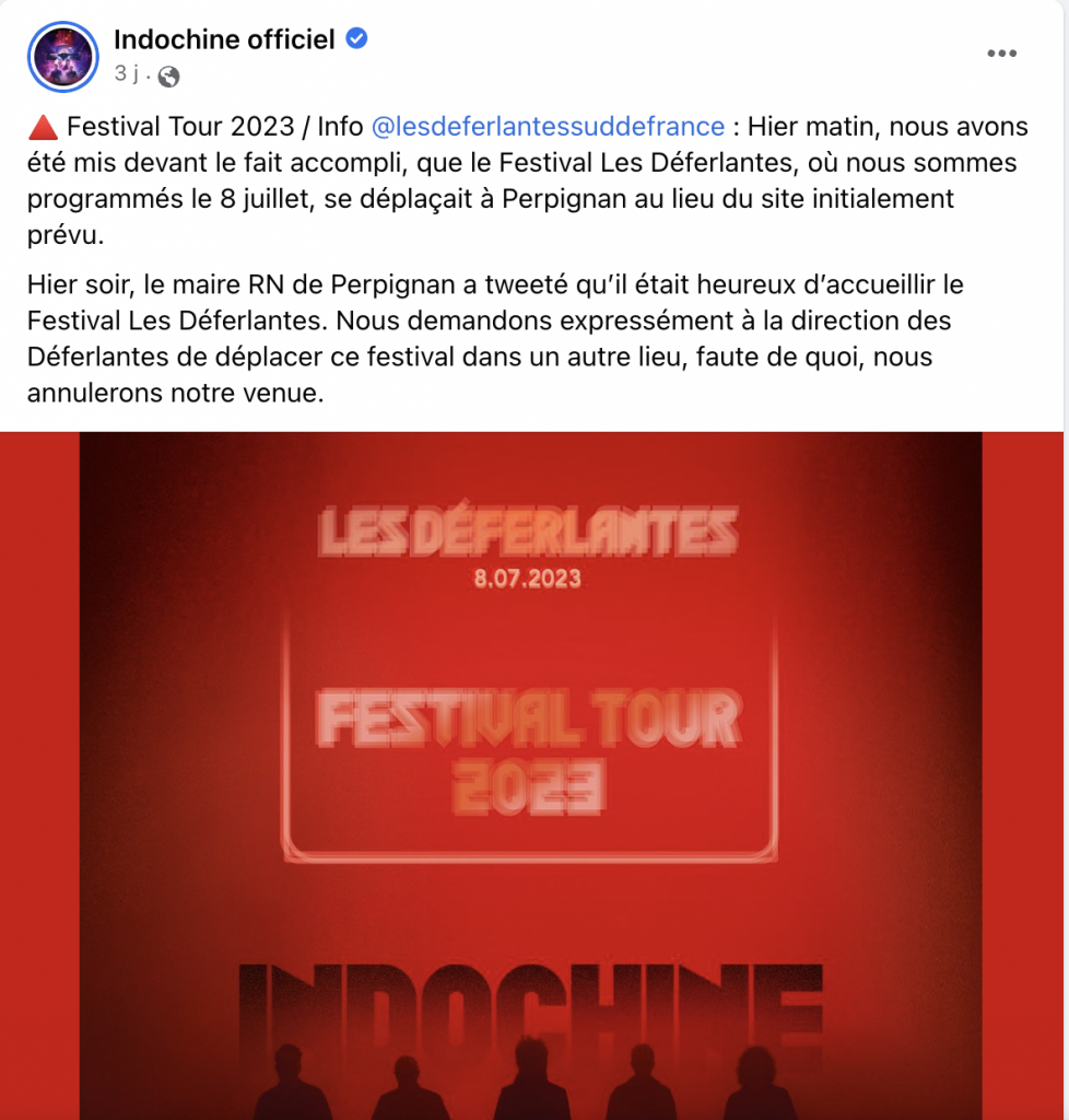 Sur leurs réseaux sociaux, l’événement des PO, les Déferlantes, annonce sa venue à Perpignan en lieu et place de Céret pour l’été 2023. Mais voilà, il semblerait que cette décision a été prise sans concertation avec les artistes. Et Indochine n’a pas tardé à réagir, demandant expressément de changer à nouveau le cadre du festival, loin de la ville gérée par le Rassemblement National et qui s’est félicitée d’accueillir l’événement. Mais voilà, fort de son engagement politique depuis plus de 40 ans, de son discours contre le racisme, l’homophobie et la haine, il est impensable pour le groupe de Nicola Sirkis de jouer à Perpignan.