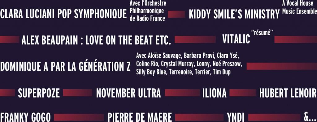 Avec l’annonce de sa tenue en janvier, l’Hyper Weekend Festival 2022 dévoile une partie de sa programmation, qui conjuguera des soirées avec plusieurs artistes au Studio 104 ( dont Iliona, Superpoze, Terrier, YNDI, Hubert Lenoir, Kiddy Smile…) tandis qu’il y a des concerts événements en parallèle avec Clara Luciani en mode symphonique avec l’Orchestre Philharmonique de Radio France, Vitalic en mode « résumé » et Alex Beaupain et son show « Love On The Beat etc. ».